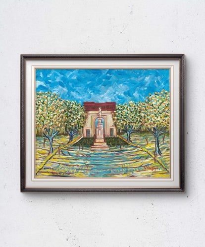 This piece reimagines Van Gogh’s Orchard in Blossom (1888) within the iconic setting of Glasgow Green and the McLennan Arch, Glasgow’s own Arc de Triomphe.